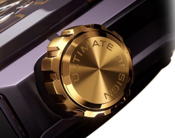 Y, como cada detalle cuenta, la corona del reloj también está chapada en oro de 18 quilates, y muestra exquisitos motivos trapezoidales en 3D, elaborados minuciosamente con gran precisión. Por otro lado, la correa está fabricada en aleación de titanio TC4, con un acabado de recubrimiento iónico púrpura de grado aeroespacial y detalles en oro de 24 quilates, para una durabilidad excepcional y una estética refinada.